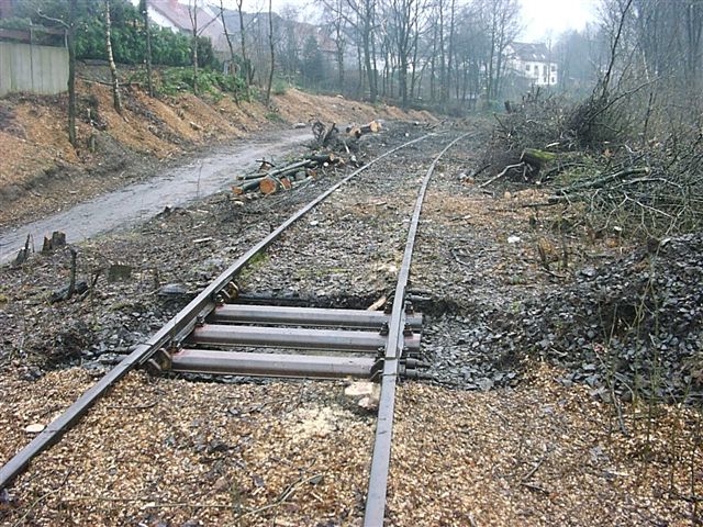 auf dem dahinter liegenden Gleis beginnen. Außer mannshoch aufgeschichtetem Baumschnitt