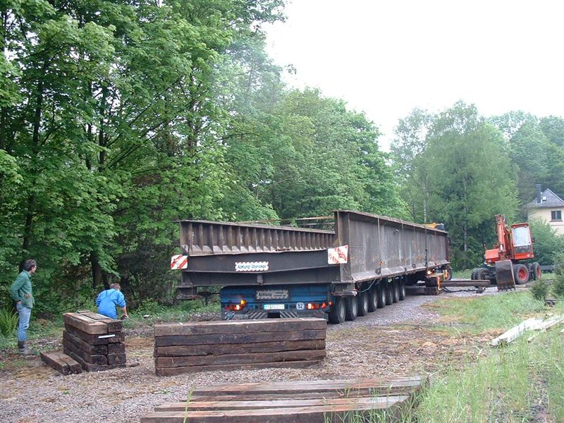 Größte Präzision war auch beim zielgerichteten rückwärts Rangieren des Schwertransportes in eine vorbereitete Gasse aus für das Brückenelement vorgesehenen vier Lagerböcken erforderlich